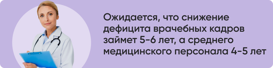 Новые меры кадровой политики в здравоохранении способствуют снижению дефицита врачей. Врачи и медицинские работники получают социальные выплаты и льготы. Также до 2030 года действуют программы «Земский доктор» и «Земский фельдшер». Они позволяют молодым врачам и фельдшерам получить до 2 млн рублей при переезде в сельскую местность.