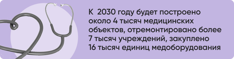 Федеральный проект направлен на обеспечение граждан России качественной и доступной медицинской помощью. В рамках нацпроекта строятся и ремонтируются поликлиники, фельдшерско-акушерские пункты (ФАПы) и врачебные амбулатории. Оснащаются современным оборудованием медицинские учреждения, обновляется автопарк скорой и неотложной помощи.